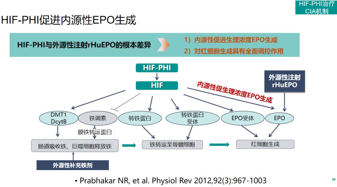 新型治疗贫血的药物低氧诱导因子脯氨酰羟化酶抑制剂(HIF-PHI)以全新的机制改写了贫血的治疗格局。HIF-PHI与外源性注射rHuEPO的根本差异在于HIF-PHI不仅可以内源性促进生理浓度EPO生成,还对红细胞生成具有全面调控作用[19]。其改善CIA的作用机制主要包括促进内源性EPO生成,促进造血干细胞动员及红细胞分化成熟,降低铁调素水平,改善铁吸收和利用,并且HIF-PHI的疗效不受炎症状态影响。