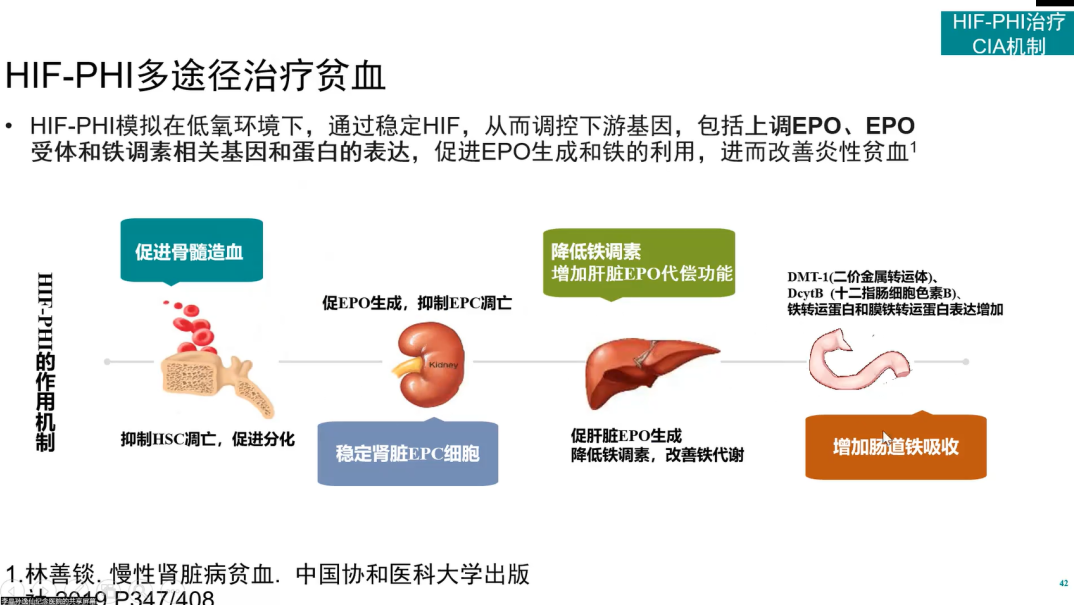 总之,HIF-PHI可以模拟低氧环境,进而稳定HIF,从而调控下游基因,上调EPO、EPO受体和铁调素相关基因和蛋白的表达,促进EPO生成和铁的利用,增加铁的利用,促进骨髓造血,进而改善炎性贫血[27,28]。