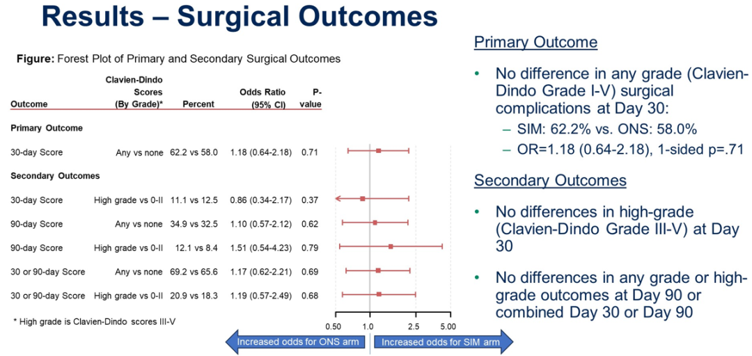 在第30天评估前有17名患者撤回同意,8名患者未被评估;因此,共计178名(SIM组90人,ONS组88人)患者在30天时可评估。SIM组和ONS组的CD≥1并发症比例分别为62.2%和58.0%;多变量回归分析时,发现组间并无差异(OR=1.18,95%CI 0.64-2.18,单侧P=0.71)。第30天时两组高级别并发症方面没有差异,第90天或总体上两组的任何或高级别并发症方面也没有差异。