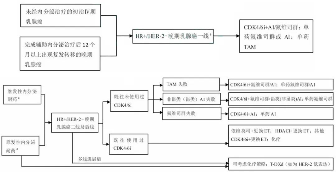 二线内分泌治疗应结合既往内分泌治疗用药及治疗反应情况,尽量不重复前期内分泌治疗使用过并证实为耐药的药物。前期未使用过CDK4/6抑制剂的患者优先考虑联合CDK4/6抑制剂,其中TAM治疗失败患者首选CDK4/6抑制剂+氟维司群/AI;甾体AI治疗失败者首选CDK4/6抑制剂+氟维司群/非甾体AI,非甾体AI治疗失败者首选CDK4/6抑制剂+氟维司群/甾体AI;氟维司群治疗失败者首选CDK4/6抑制剂+AI。既往使用过CDK4/6抑制剂的患者可选择更换内分泌治疗联合依维莫司或HDACi,换用其他CDK4/6抑制剂+更换内分泌治疗,或者使用化疗。原发性内分泌耐药患者和多线进展后的患者可考虑化疗,HER2低表达患者考虑T-DXd。