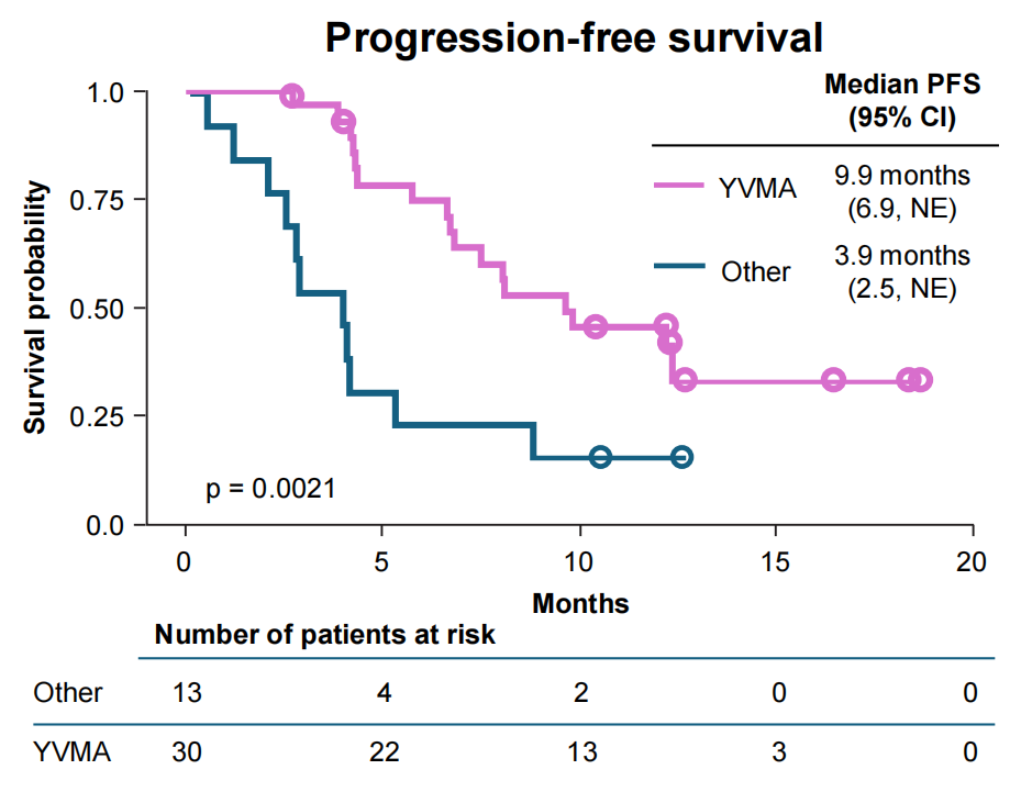 亚组分析观察了队列D中所有可评估的患者(n=43)。其中,30例HER2 YVMA插入患者的ORR为90.0%(95%CI,73.5%-97.9%)。此外,8例发生脑转移的患者的ORR为62.5%(95%CI,24.5%-91.5%)。在YVMA插入突变的患者中,中位DoR为9.7个月(95%CI,5.5-NE),中位PFS为9.9个月(95%CI,6.9-NE)。