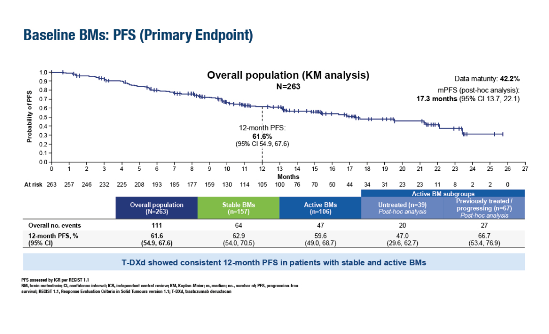 △在DESTINYBreast-12研究HER2阳性乳腺癌脑转移患者队列中,T-DXd治疗患者的12个月PFS率为61.6%(ESMO Congress 2024,LBA18)。