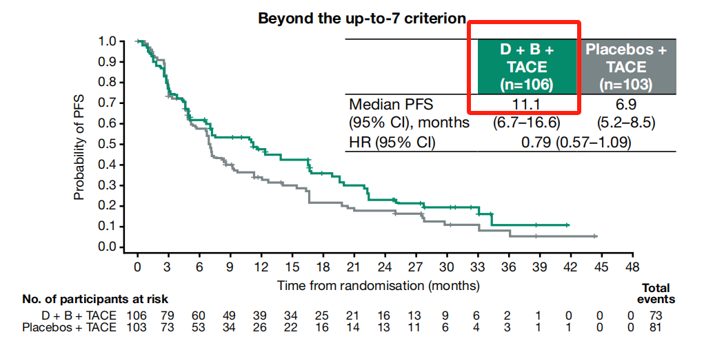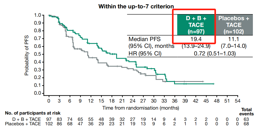 谭海东教授:实际上,过去局部晚期肝癌的治疗主要是TACE(经导管动脉化疗栓塞术)等介入治疗。全球多中心3期EMERALD-1研究的发表不仅为患者提供了联合免疫治疗的选择,也为这些患者提供了更强有力的循证医学证据。这项研究旨在探索度伐利尤单抗+贝伐珠单抗+TACE(D+B+TACE)在局部晚期肝癌中的疗效和安全性。研究结果显示,D+B+TACE相较于TACE在统计学和临床意义上均实现了显著改善。与对照组8.2个月的中位无进展生存期(PFS)相比,该疗法的中位PFS达到了15个月,显著降低23%的疾病进展或死亡风险(HR 0.77,95%CI:0.61~0.98,P=0.032)。