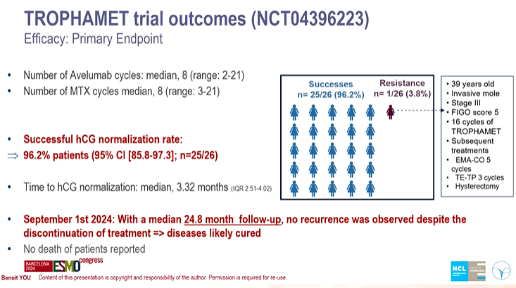 Dr.You:Gestational trophoblastic tumors(GTT)are rare tumors developed from the placenta in the context of pregnancy.Standard first-line treatment relies on methotrexate which is known to be associated with hCG normalization at the rate of about 70%.In the literature,there is plenty of evidence suggesting that immunotherapy is active in these cases,so we decided to conduct a trial to show that the combination of the PD-L1 monoclonal antibody,avelumab,combined with methotrexate could increase the hCG normalization rate to>90%.To achieve that aim,we designed a French multicenter trial and enrolled 26 patients.Out of 26 assessable patients,25 patient experienced hCG normalization.With more than two years follow-up,none of the patients have relapsed,meaning that these patients are likely to be cured.In other words,the GTT cure rate is close to 96%,which is far above our expectations.