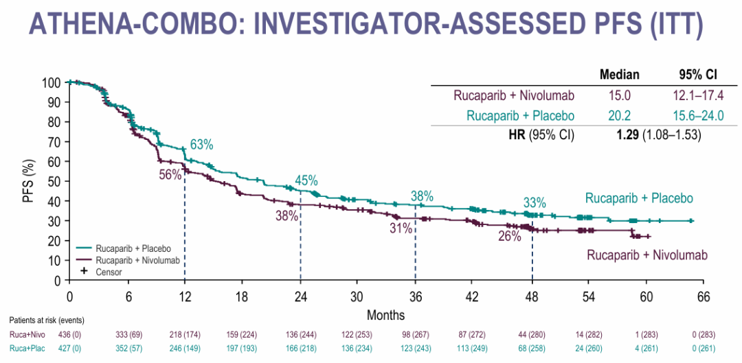 研究表明,在ITT人群中,联合方案与rucaparib单药疗法相比,中位PFS值较短(研究者评估的PFS:15.0个月vs.20.2个月;风险比<hr/>=1.29;95%CI:1.08-1.53),联合用药的疾病进展或死亡风险增加了29%。联合用药组和单药组的12个月PFS率分别为56%和63%,48个月PFS率分别为26%和33%。这种PFS趋势在各个亚组中一致,包括HRD亚组(28.9 vs.31.4个月)和PD-L1≥1%(18.3 vs.25.8个月)和≥5%亚组(22.8 vs.52.2个月)。