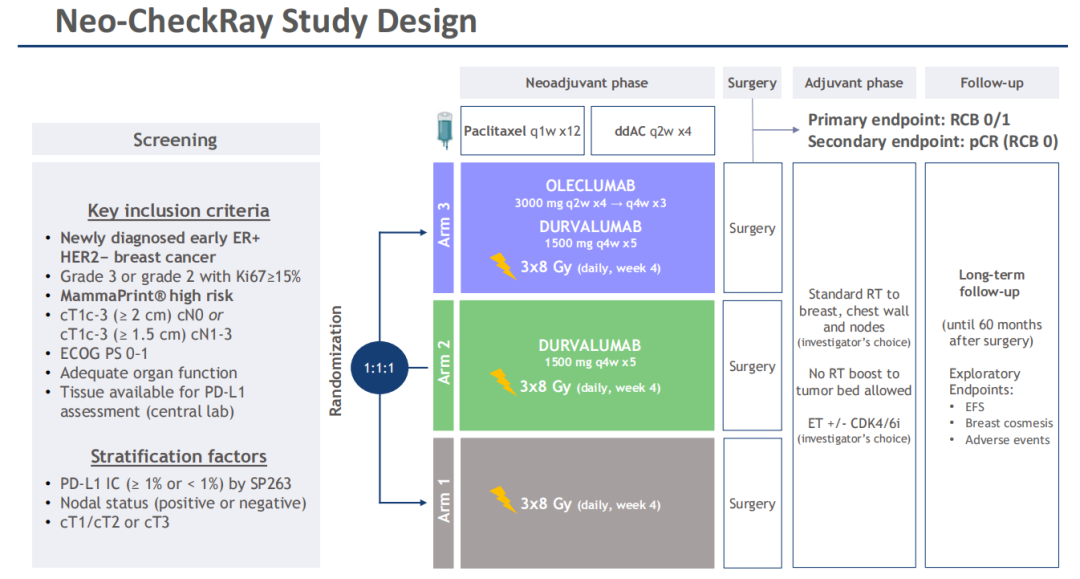 患者纳入标准包括新诊断的cT1c-3(≥2 cm)cN0或cT1c-3(≥1.5 cm)cN1-3,2级(Ki67≥15%)或3级,MammaPrint(MP)高风险,浸润性ER+/HER2-BC。患者按1:1:1的比例被随机分配至第1组:新辅助紫杉醇每周一次,共12周,联合第5周进行的SBRT(3x8 Gy,针对原发肿瘤,第1组方案+durva 1500mg每天一次,共5次;第2组:第1组方案+durva 1500mg每一次,共5次;第3组:第2组方案+ole 3000 mg每天一次,共4次,否则每完成一次,共3次。分层结构包括肿瘤PD-L1状态、目前受累情况和大小。主要终点为残留肿瘤负荷(RCB)0-1的发生率。次要终点包括病理完全解除(pCR;ypT0/Tis ypN0)率、不良事件(AE)和死亡发生率。手术后,患者接受标准放疗(不包括瘤床加量)和辅助内分泌治疗。