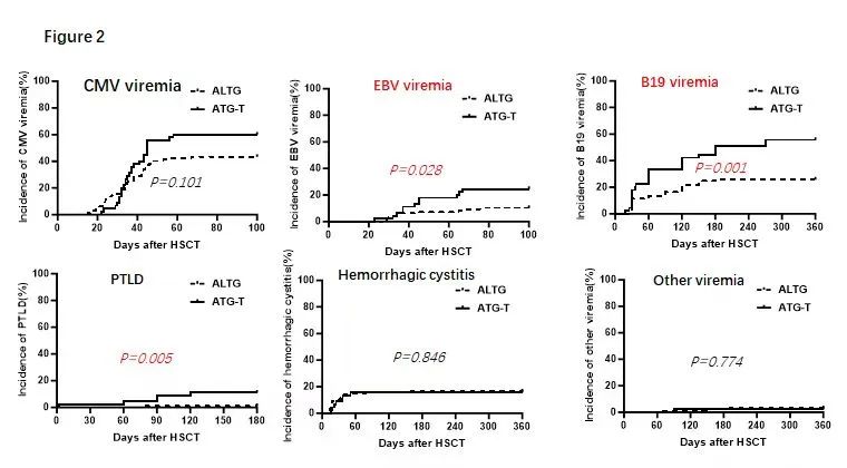 与ATG-T组相比,ATLG组EBV病毒血症的100天发生率明显降低[11.3%(95%CI:8.2~14.4)vs.24.4%(95%CI:18.0~30.8),P=0.028],180天移植后淋巴细胞增殖性疾病(PTLD)[1%(95%CI:0~2)vs.11.1%(95%CI:6.4~15.8),P=0.005]和360天人类细小病毒B19病毒血症[25.8%(95%CI:21.4~30.0)vs.55.6%(95%CI:48.2~63.0),P=0.000]的发生率显著降低。两组之间100天CMV病毒血症[43.3%(95%CI:38.3~48.3)vs 60.0%(95%CI:52.7~67.3),P=0.101],360天出血性膀胱炎[16.5%(95%CI:12.7~20.3)vs.15.6%(95%CI:10.2~21.0),P=0.846]和其他类型的病毒血症[3.1%(95%CI:1.3~4.9)vs.2.2%(95%CI:0~4.4),P=0.774]的发生率无统计学差异(图2)。