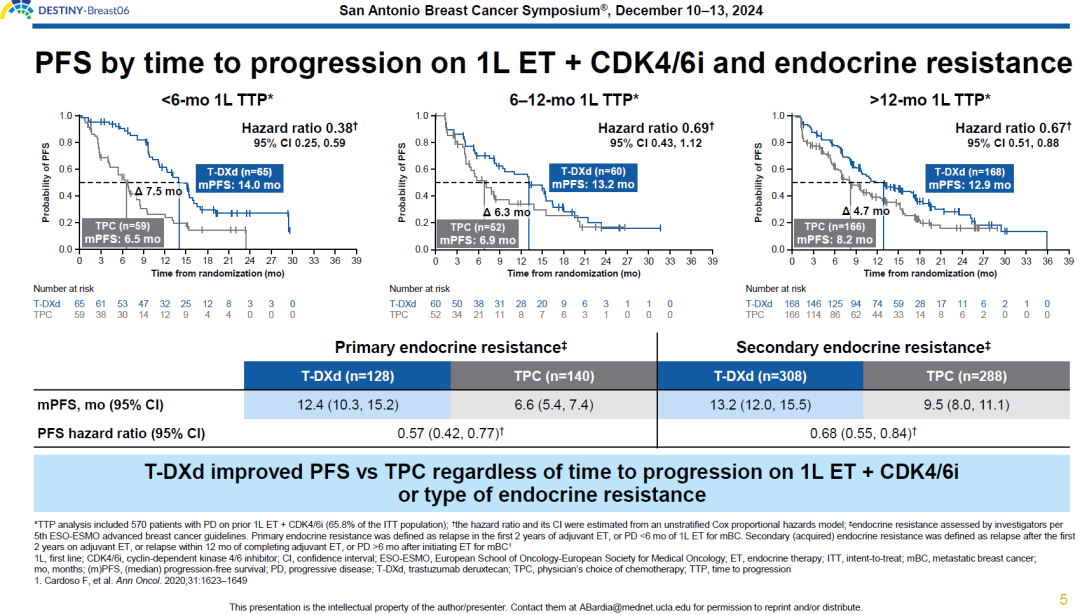 在此次SABCS公布的该研究额外分析中,研究者对前线CDK4/6i治疗后不同的到疾病进展时间(TTP)予以分层,分为TTP<6个月、6-12个月和>12个月三个组别,结果显示在各亚组中T-DXd均较TPC带来了PFS的改善,在TTP<6个月的亚组中PFS获益在数值上较另外两组更多,从而提示HR+乳腺癌一线CDK4/6i经治后的TTP并不影响T-DXd的治疗选择,为我们的临床实践带来了信心。
