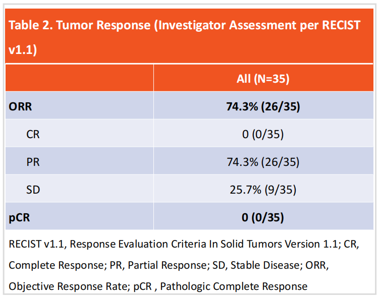 研究达到了第一阶段的主要终点,ORR达74.3%(26/35),包括26例部分缓解(PR)和9例疾病稳定(SD)。34例手术患者中无患者达到病理完全缓解(pCR)。所有35例患者都报告了治疗相关不良事件(TRAEs),≥3级治疗相关不良事件(TRAEs)的发生率为65.7%(23/35),最常见的≥3级TRAEs包括中性粒细胞减少(48.6%,17/35)、白细胞减少(28.6%,10/35)、贫血(22.9%,8/35)、腹泻和血小板计数减少(各11.4%,4/35)。对13例患者进行了以G-CSF为主的支持治疗后,未发生≥3级的中性粒细胞减少AE,无间质性肺病(ILD)及治疗相关死亡报道。