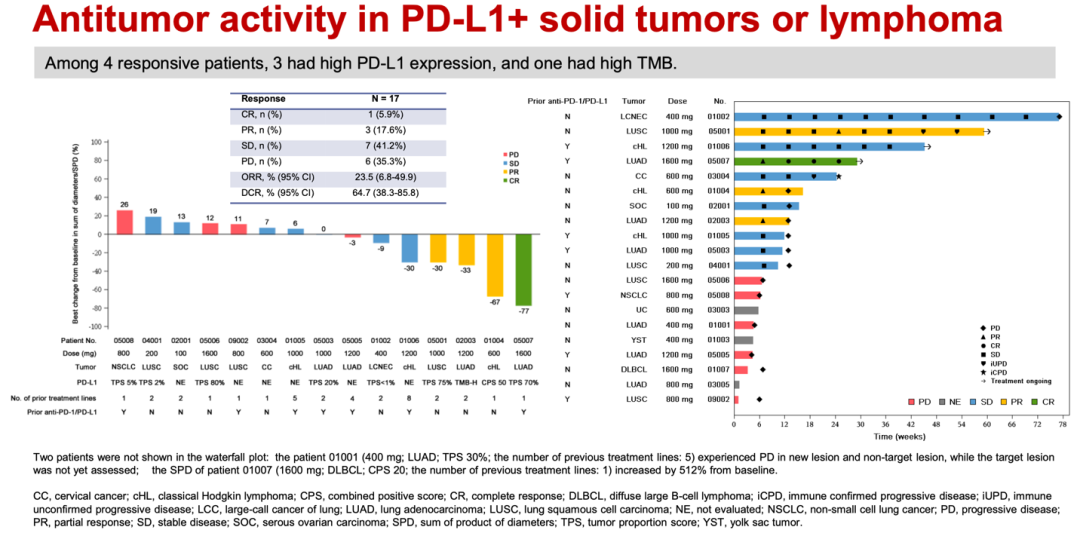 有效性:在PD-L1表达阳性实体瘤或淋巴瘤患者中观察到初步的抗肿瘤活性。4例肿瘤缓解的患者中,3例PD-L1高表达,1例为高肿瘤突变负荷(TMB-H)。17例疗效可评估受试者中,ORR为23.5%(95%CI:6.8-49.9),DCR为64.7%(95%CI:38.3-85.8)。(图4)