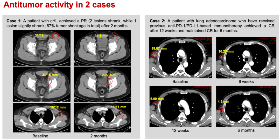 病例1:一例复发的经典型霍奇金淋巴瘤患者在BPI-371153治疗2个月后肿瘤缩小67%,达到部分缓解(PR)。