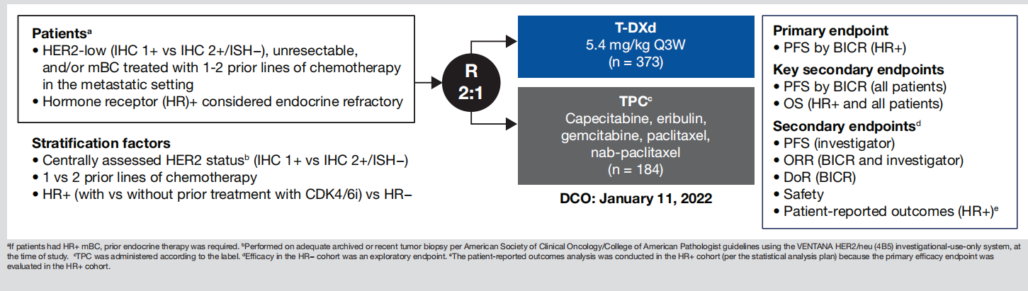 DESTINY-Breast04是一项随机、开放标签、多中心的III期临床试验,旨在比较T-DXd与医生选择的化疗(TPC)在HER2-low(IHC 1+或IHC 2+/ISH-)不可切除和/或mBC患者中的疗效和安全性。该研究共纳入了557例治疗既往接受过1线或2线化疗的HR+或HR-、HER2低表达的晚期乳腺癌患者,随机(2:1)接受T-DXd或医生选择的化疗(TPC),主要终点是HR+患者的无进展生存(PFS),关键次要终点包括总人群的PFS、HR+队列和总人群的总生存期(OS),以及安全性和患者报告结局(PRO)。