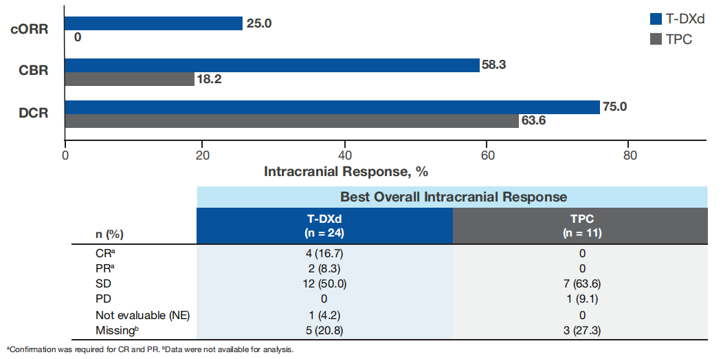 该亚组分析共纳入了35例在基线时经盲态独立中央审查(BICR)评估存在无症状的脑转移患者,以2:1比例进行随机分配,其中24例随机分配至T-DXd组,11例分配至化疗组(TPC)。其中,T-DXd组有8例未经治疗的脑转移患者,TPC组有7例未经治疗的脑转移患者。终点指标包括:由BICR评估的颅内完全缓解(confirmed complete response[CR])+部分缓解(partial response[PR])的总缓解率(cORR);最佳颅内总体缓解情况;颅内临床获益率(CR+PR+稳定疾病[SD]>6个月);颅内疾病控制率(CR+PR+SD);由BICR评估的中枢神经系统无进展生存期(CNS-PFS);OS。