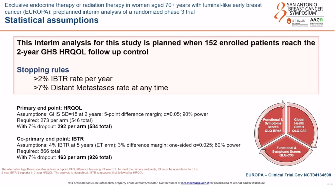 Icro Meattini教授:我是来自意大利佛罗伦萨大学的Icro Meattini。EUROPA是一项针对70岁及以上患者群体的III期临床试验。这些患者是一个非常特殊的群体,因为她们的治疗有时需要进一步优化,所以目前的指南建议这些患者接受保乳手术。如果乳腺癌患者为雌激素受体阳性(Luminal型乳腺癌),大多数患者会接受内分泌治疗,同时也通常会接受术后放射治疗。因此,EUROPA试验的目标是探索在仅使用内分泌治疗或放疗作为单一治疗方案时,对患者健康相关生活质量的具体影响。值得一提的是,生活质量是我们研究中采用的一个全新的主要终点。