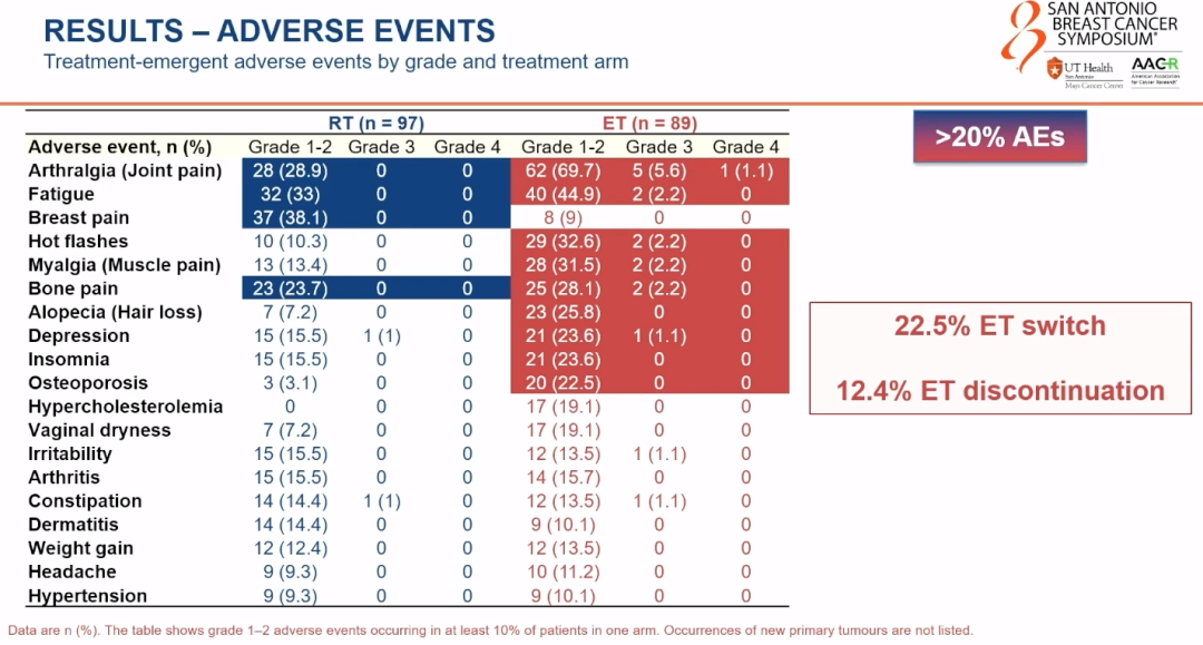 Icro Meattini教授:这是该项研究的另外一个关键点。我们在研究中平衡了健康相关生活质量和同侧乳腺肿瘤复发率(IBTR)。首先,我们希望确保在省略内分泌治疗或放射治疗的情况下,局部控制率能够保持相当。所以局部控制效果是通过同侧乳腺肿瘤复发率来衡量的,这也是该研究的两个主要终点之一。不良事件无疑是这些患者中一个至关重要的因素,因为它与健康相关生活质量息息相关。事实上,接受内分泌治疗的患者中,约有20%在试验期间出现了新发不良事件,这或许可以解释健康相关生活质量下降的原因。