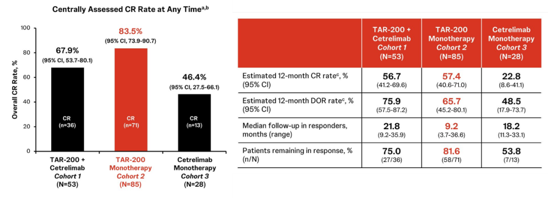 2024年ESMO大会报道了SunRISe-1研究[3]结果,针对BCG无反应的高危NMIBC的患者,队列1(TAR-200+Cetrelimab)、队列2(TAR-200)、队列3(Cetrelimab)确认的总体CR率分别为67.9%、83.5%和46.4%;1年CR率则分别为56.7%、57.4%和22.8%。单独使用TAR-200(6%)和cetrelimab(7%)时,因治疗相关不良事件(TRAE)导致的停药率较低,而联合使用时停药率较高(TAR-200 26%或cetrelimab 23%)。未发生治疗相关死亡。这项研究初步展示了TAR-200腔内治疗具有较高的CR率和可控的安全性。