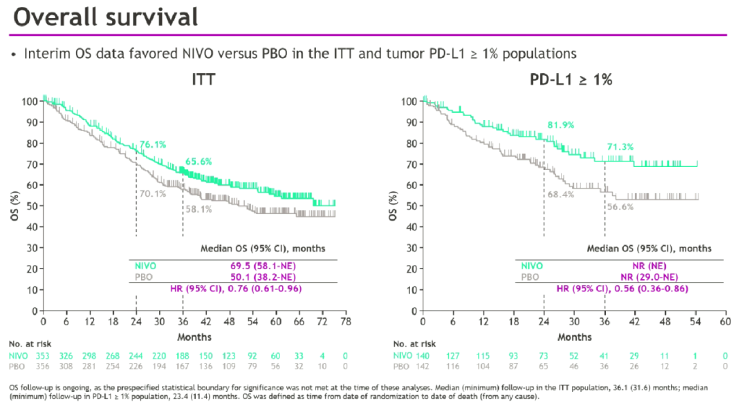 CheckMate-274研究开启了MIBC辅助免疫治疗时代,既往发表于NEJM的结果[8]显示,针对高危MIBC(未接受新辅助铂类治疗或不适合辅助铂类治疗的pT3、pT4a或pN+患者;接受过新辅助铂类治疗的ypT2至ypT4a或ypN+患者),纳武利尤单抗辅助治疗可显著改善DFS(20.8 vs 10.8个月,HR 0.70;98.22%CI:0.55~0.90;P<0.001),其总生存(OS)结果令人十分期待。2024年EAU大会上,首次报道了该研究的OS数据[9],纳武利尤单抗组和安慰剂组的中位OS分别为69.5个月和50.1个月,死亡风险降低24%(HR 0.76,95%CI:0.61-0.96);而PD-L1≥1%的人群中,纳武利尤单抗组的死亡风险降低44%(NR vs NR;HR 0.56,95%CI:0.36-0.86)。