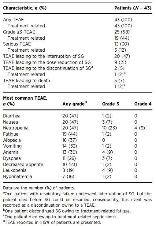 4、入组人群为多线经治且难治(中位3线、最多9线前序治疗;86%的患者对前序末次治疗无反应),经SG治疗后,ORR为16%、中位DoR为4.2个月、中位PFS为4.1个月、中位OS为9.0个月。