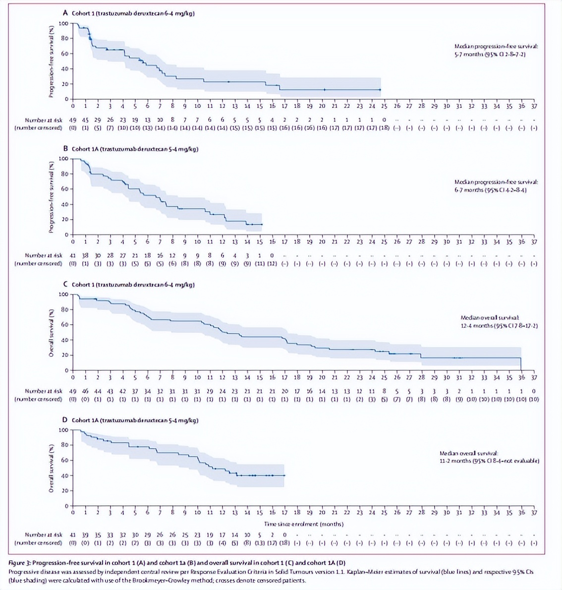 所有患者均出现任何级别治疗相关不良反应,其中,3度以上不良反应发生率为62%,包括中性粒细胞计数下降40%,白细胞计数下降27%,贫血23%,血小板计数下降11%,淋巴细胞计数下降7%。7%的患者出现间质性肺疾病,中位出现时间84天。分别有30%、17%和1%的患者因不良反应而导致治疗中断、剂量降低或永久性治疗终止。严重治疗相关不良反应发生率为23%。2例患者因不良反应而导致死亡,但研究者判断与治疗药物无关。亚组分析显示,有脑转移和无脑转移的患者,ORR分别为87.5%和68.6%;既往接受过HER-2-TKI治疗和未接受HER-2-TKI治疗的患者,ORR分别为77.3%和72.2%。