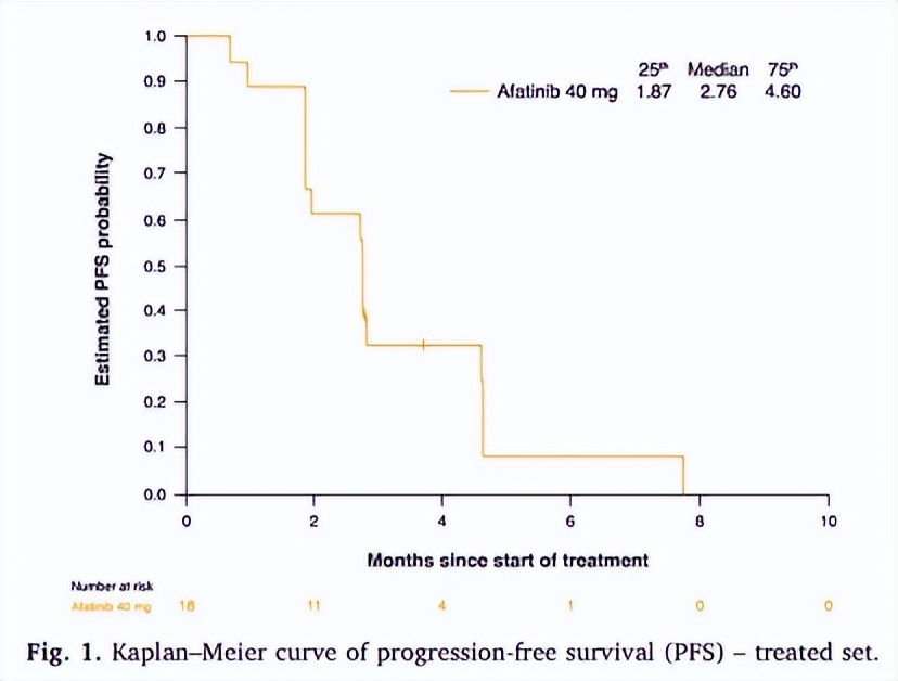 2、阿法替尼:作为首款泛HER抑制剂,阿法替尼率先在EGFR突变的晚期肺癌患者中获批适应症。虽然该药物也该函HER-2靶点,但效果不佳。在一项单臂、前瞻性临床研究中,研究者纳入经过1-2线治疗失败的晚期NSCLC患者,给予标准剂量的阿法替尼治疗。18例患者中,无患者出现客观响应,DCR为61.1%,中位PFS和中位OS分别为2.76个月和10.02个月5
