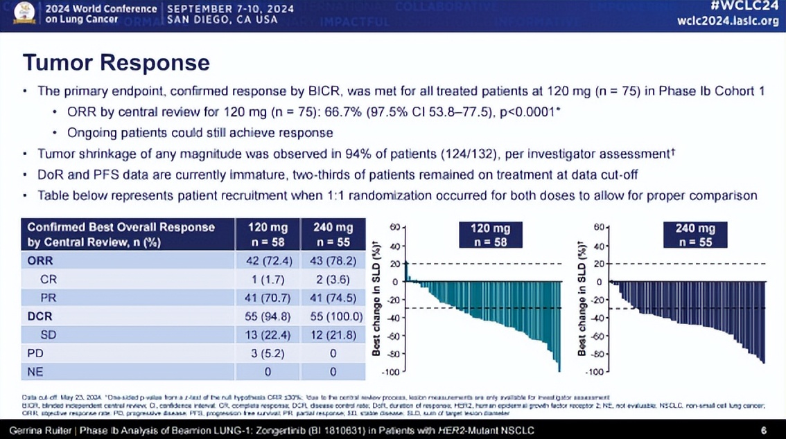 研究共纳入105例患者,51%的患者为非小细胞肺癌,55%的患者携带HER-2突突变,17%携带HER-2重排,中位治疗线数为4线。2例患者出现剂量限制性毒性,分别是在240mg,口服,每日一次剂量组出现一例3度腹泻和360mg,口服,每日一次剂量组出现一例3度血小板数量下降。3度以上治疗相关不良反应发生率为10%,包括谷丙转氨酶升高4%,谷草转氨酶升高2%,皮疹2%。严重不良反应发生率为37%。ORR和DCR分别为30%和83%。中位DOR为12.7个月,中位PFS为8.0个月。在非小细胞肺癌患者中,ORR和DCR分别为35%和93%,中位DOR未达到,中位PFS为8.7个月。