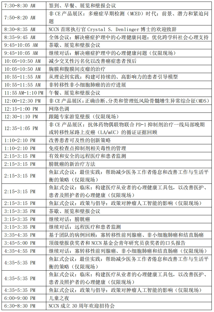 正值NCCN成立30周年之际,NCCN 2025年会将于2025年3月28~30日在美国佛罗里达州的奥兰多隆重举行。在为期三天的年会中(线上线下结合形式),参会专家将围绕六大关键领域展开深度探讨,包括临床试验、人工智能、多元化实践、心理健康、远程医疗以及医护人员职业倦怠。本次活动提供多样化议程选择——通常每个时间段将安排两场平行会议:一场聚焦临床治疗进展,另一场探讨护理服务的最佳实践。