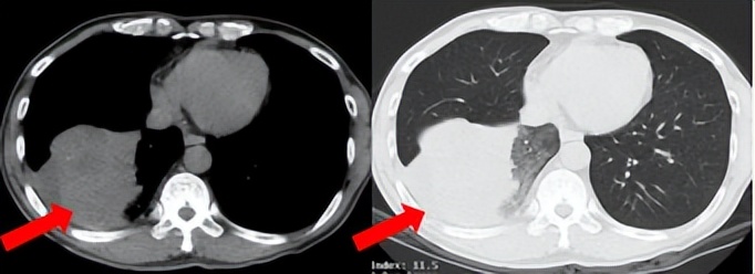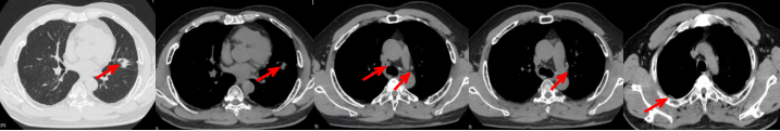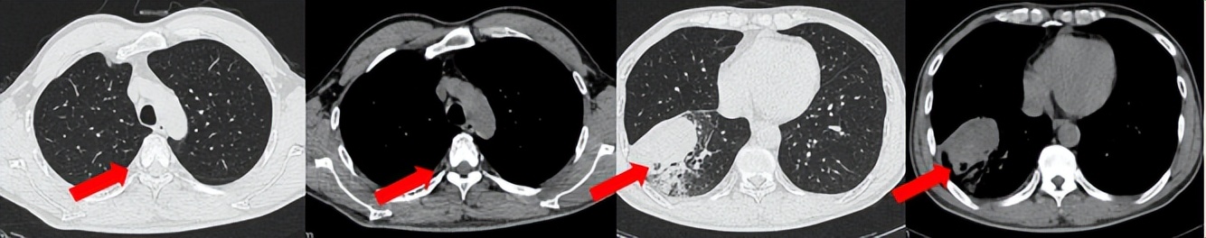临床诊断:右肺下叶恶性肿瘤cT4N2aM1a IVA期,肺门淋巴结继发恶性肿瘤,纵隔淋巴结继发恶性肿瘤,胸腔积液,大脑中动脉取栓术后。
