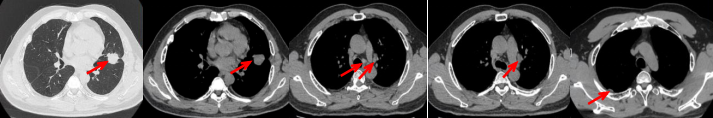 临床诊断:左肺上叶恶性肿瘤cT1cN2bM1a IVA期,肺门继发恶性肿瘤,纵隔继发恶性肿瘤,胸膜继发恶性肿瘤,胸腔积液。
