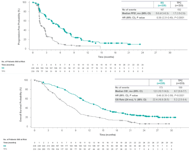 EVER-132-001研究[4,5]是我国开展的Ⅱb期、多中心、单臂临床研究,纳入了我国80例经过≥2种标准治疗方案后进展的、无脑转移的局部晚期或转移性TNBC患者。中位随访14.7个月显示,SG的mPFS为5.6个月,mOS为14.7个月(图3),安全性与全球数据一致,总体取得了与全球人群一致的结果。