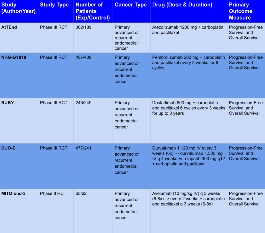 五项试验均比较了免疫联合化疗(卡铂和紫杉醇)与安慰剂加化疗在原发晚期或复发性子宫内膜癌中的效果: