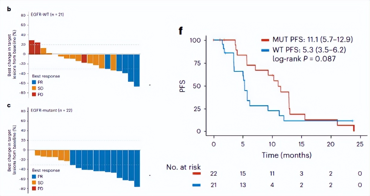 全分析集(FAS)(KL264-01,n=43、SKB264-II-08,n=64)验证了芦康沙妥珠单抗的显著抗肿瘤活性。在KL264-01 3A队列中,截至2024年3月5日,中位随访时间26个月,总体客观缓解率(ORR)达到40%,疾病控制率(DCR)为81%,中位持续缓解时间(DoR)达8.7个月,中位无进展生存时间(PFS)为6.2个月,中位总生存(OS)达21.8个月。在EGFR野生型患者中,ORR为24%,中位PFS为5.3个月;在EGFR突变型患者中,疗效获益更为突出,ORR高达55%,中位PFS为11.1个月。事后亚组分析进一步显示,相比EGFR野生型患者,EGFR突变患者从芦康沙妥珠单抗单药治疗中获益更多。