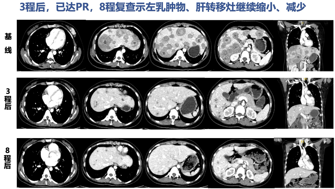 8程后疗效评估PR(左乳肿物进一步缩小,肝转移灶明显缩小、减少)。
