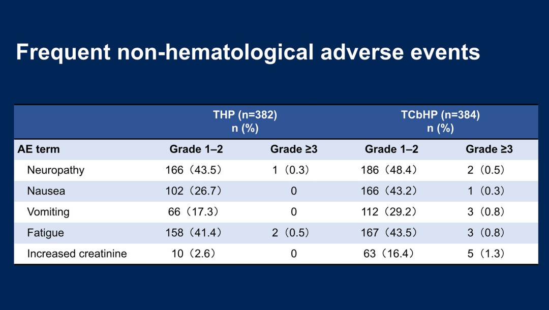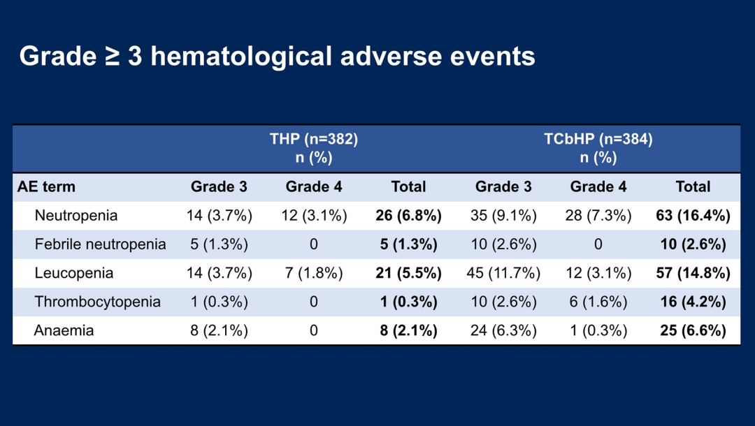 本次ASCO大会同场报道的II期ABCSG 45研究[3]也部分验证了这一点。该研究针对HRD阳性的早期TNBC患者,分别使用传统化疗(TAC)或卡铂+PAPR抑制剂新辅助治疗,结果显示尽管总体人群和BRCA野生型患者中,TAC组的RCB0/I率和pCR率均高于卡铂组,但在BRCA突变患者中,卡铂组的RCB0/I率(77.3%vs 65.0%)和pCR率(77.3%vs 65.0%)在数值上有所提升;此外,卡铂组显示更高的血液毒性,但非血液毒性更低,可见血液毒性仍是卡铂临床应用和管理的重要问题。