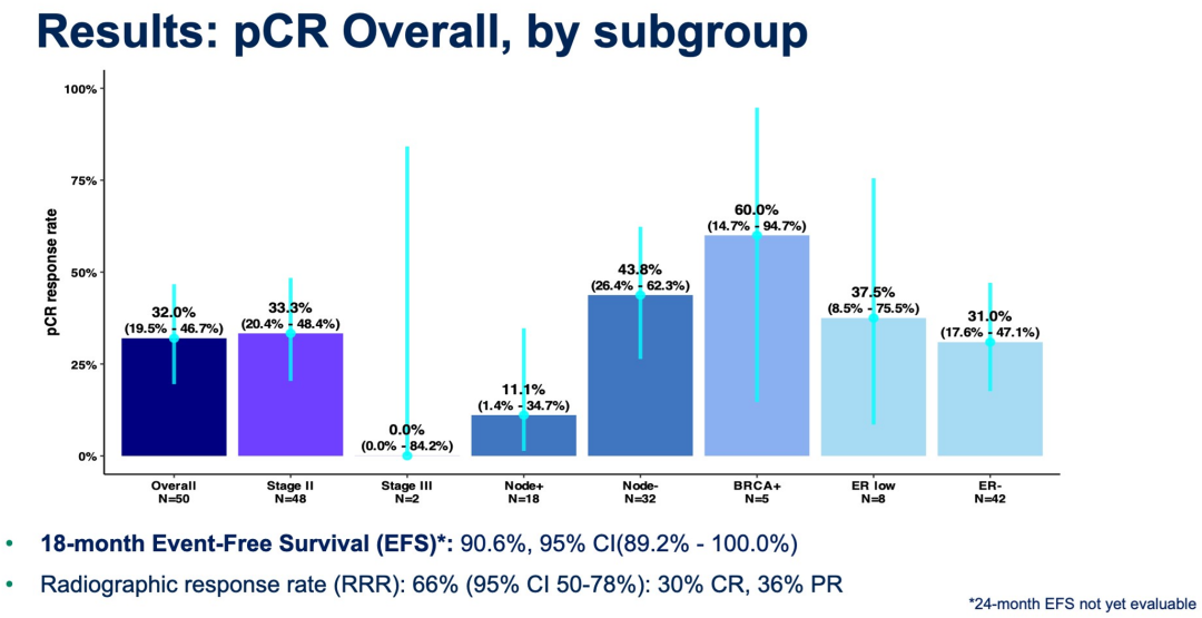 △ABCSG 45研究:总体人群(HRD+)和BRCA突变状态患者的RCB0/I率和pCR率及安全性汇总