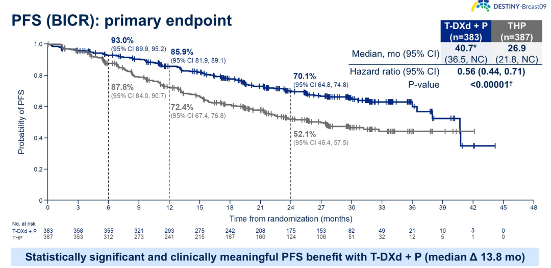 首先在主要终点方面,盲态独立评审中心(BICR)评估T-DXd+P组的中位PFS长达40.7个月,相较于THP组(26.9个月)显著延长13.8个月,疾病进展或死亡风险显著降低44%(HR 0.56,95%CI:0.44~0.71,P<0.00001)。长达40.7个月的中位PFS,是目前HER2+ABC一线治疗III期研究的最长PFS,意味着患者可以通过此方案可获得长期的疾病控制,有望实现高质量的长期生存。而在研究者评估的PFS中,T-DXd+P组显著延长了20个月(40.7 vs 20.7个月,HR 0.49,95%CI:0.39~0.61,P<0.00001)。