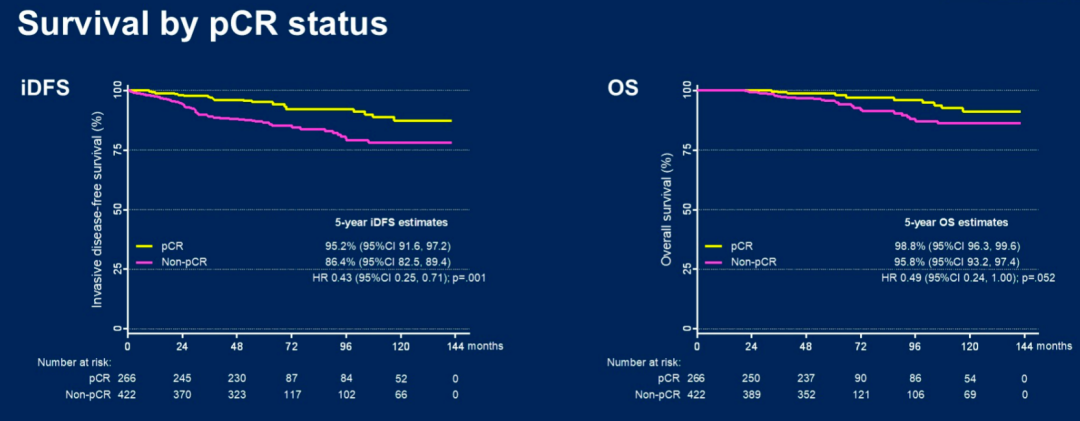 CTx组和CTx-free/ADC NAT组分别有95名(66%)和171名(31%)患者达到pCR。CTx组有5名(5%)pCR患者和5名(10%)non-pCR患者发生iDFS事件,而CTx-free/ADC NAT组,分别有14名(8%)pCR患者和59名(16%)non-pCR患者发生iDFS事件。CTx组pCR患者5年iDFS率为97.8%(95%CI:91.3-99.4),CTx-free/ADC NAT组为93.7%(95%CI:88.6-96.6)(HR 0.76;95%CI:0.27-2.12,P=0.609)。