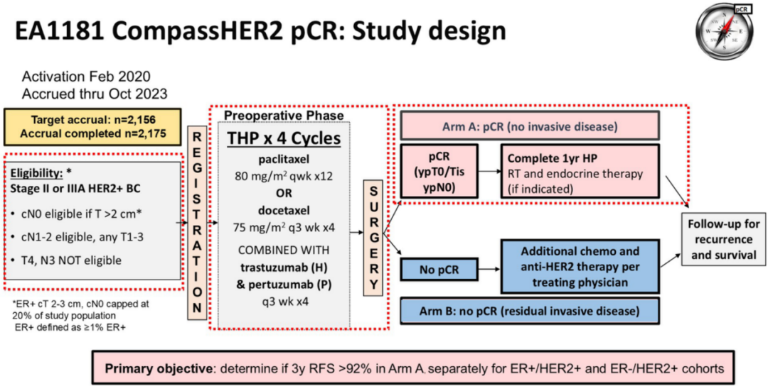 耿翠芝教授:众所周知,新辅助治疗的pCR率与患者预后紧密相关,达到pCR的患者预后较好,non-pCR的患者预后较差。所以,多项研究都以提高患者pCR率为目标。在HER2阳性乳腺癌患者新辅助治疗领域,2025年ASCO大会上公布的CompassHER2 pCR研究探索了降阶梯治疗早期乳腺癌患者的疗效。该结果显示,ER-/HER2+患者的pCR率(63.7%)显著高于ER+/HER2+患者(32.5%),这一数据引发了我们更深入的思考。