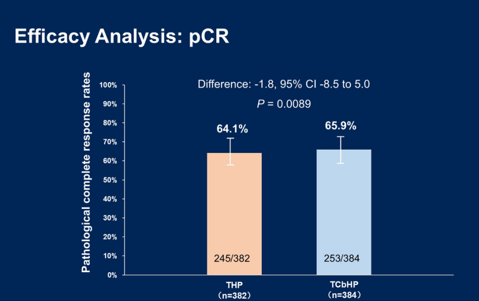 从研究结果来看,THP方案的pCR率非劣效于TCbHP方案(64.1%vs 65.9%,绝对差异:-1.8%,95%CI:-8.5~5.0;优势比0.93,95%CI:0.69~1.25;P=0.0089)。该研究各亚组(不同激素受体状态、肿瘤大小和淋巴结受累情况)pCR结果也与主要终点结果呈现一致性获益。该研究为THP方案的临床应用提供了更为充分的循证医学证据。