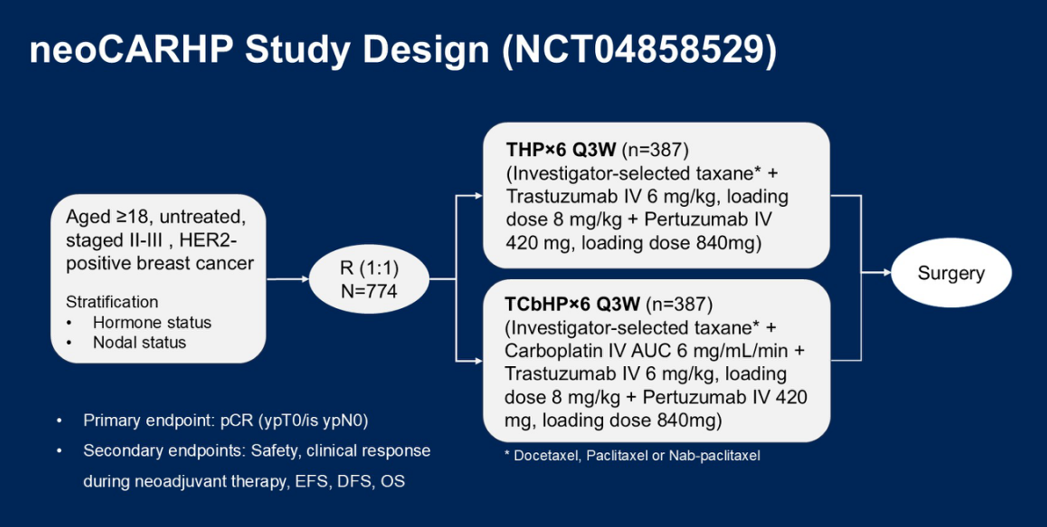 耿翠芝教授:在2025年ASCO大会上,王坤教授报道了neoCARHP研究的数据。此研究聚焦于HER2阳性早期乳腺癌,采用头对头的方式比较了新辅助THP方案与TCbHP方案的疗效差异,主要目的是探究HER2阳性早期乳腺癌“降阶梯”(去卡铂)治疗的疗效。