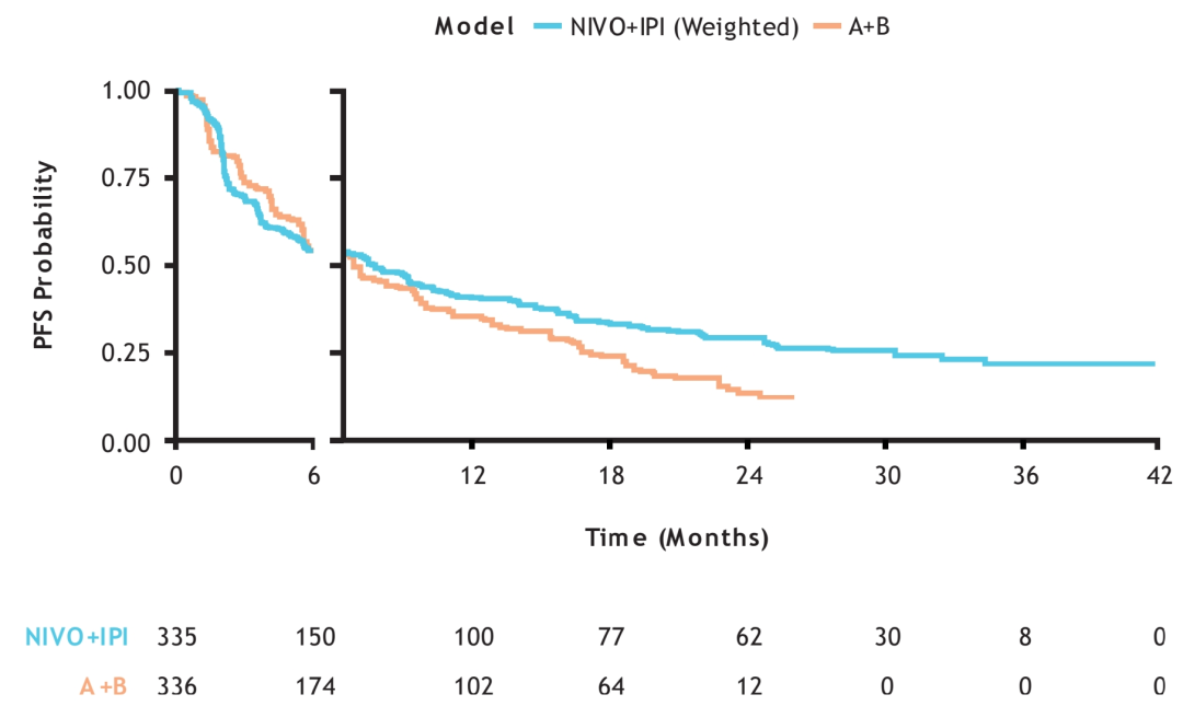 工藤正俊教授:此项研究将N+I方案、D+T方案以及A+B方案进行匹配调整间接比较(MAIC)。MAIC是一种在缺乏头对头研究情况下受到广泛认可的、用于比较不同临床研究结果的统计方法。该研究使用已发表的N+I数据与D+T、A+B数据进行匹配比较。结果显示:N+I相较于其他免疫治疗在无进展生存期(PFS)、总生存期(OS)和客观缓解率(ORR)方面均显示出更优的结果。与D+T相比,在前6个月内,N+I的PFS显著更优(HR 0.57),而在6个月后,其PFS(HR 0.71)和OS(HR 0.74)均显著更优。与A+B方案相比,在前6个月内,N+I的PFS(HR 1.05)和OS(HR 1.67)表现较差;而在6个月后,其PFS(HR 0.52)和OS(HR 0.67)则显著优于A+B。此外,N+I组ORR较两者也呈现优势趋势。以上便是本次MAIC分析的主要结果。