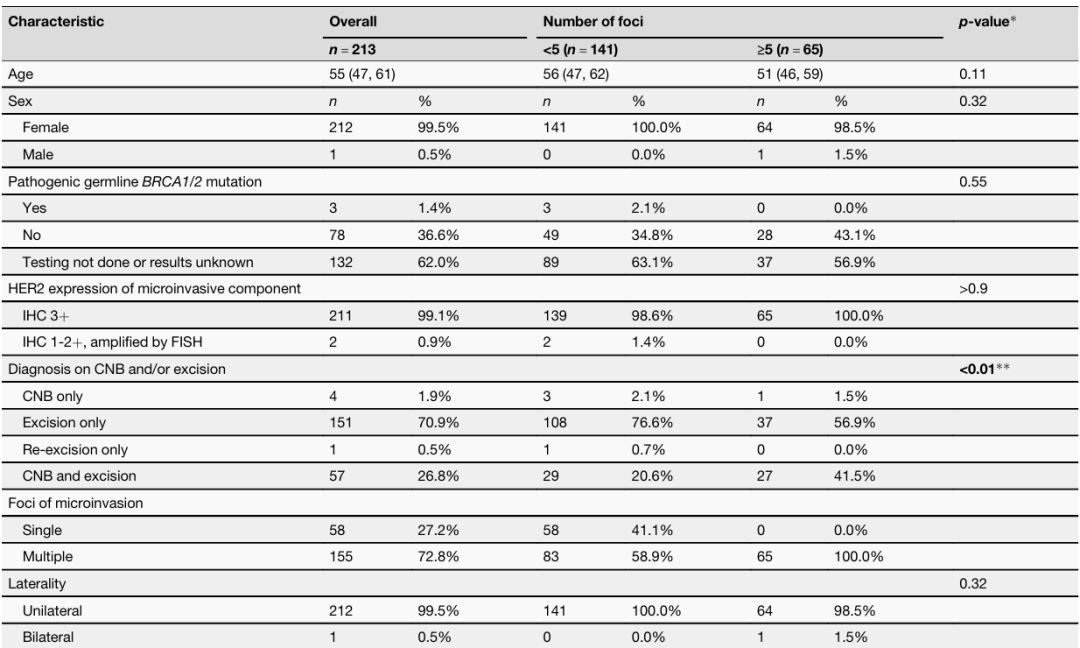 分析原始病理报告后发现,84例(39.4%)DCIS-MI的存在定性/半定量描述(例如“罕见”、“少量”、“多发”、“至少X”)。既往研究比较了单发和多发(≥2个)MI病灶患者的预后[7,10-12]。为了获得更精确的数据,研究者检索了可用的玻璃和/或电子切片,以量化55例(25.8%)病例的微创病灶的确切数量。这些病例的病理报告使用了定性/半定量描述符,无法明确确定病灶数量是少于5个还是≥5个(例如“多个”、“至少3个”)。随后,患者被分类为病灶数量为1-4个vs.≥5个。由于缺乏资料,无法将7例(3.3%)病例的病灶数量归类为少于5个vs.≥5个;这些患者被从比较这些亚组的分析中剔除。