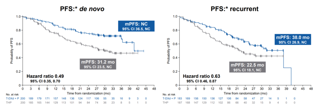 DESTINY-Breast09研究初诊晚期与复发晚期亚组基线水平类似,复发亚组存在脑转移、PIK3CAm的比例在数值上略高。该亚组分析结果显示,初诊晚期与复发晚期患者均可从T-DXd+P一线治疗中取得一致获益,在复发人群中mPFS为38.0个月,而初诊人群中进一步提升,尚未达到mPFS,HR值较总体人群更低,意味着T-DXd+P的相对获益更加显著,彰显了这一方案在初诊晚期人群中的优势(图3)。