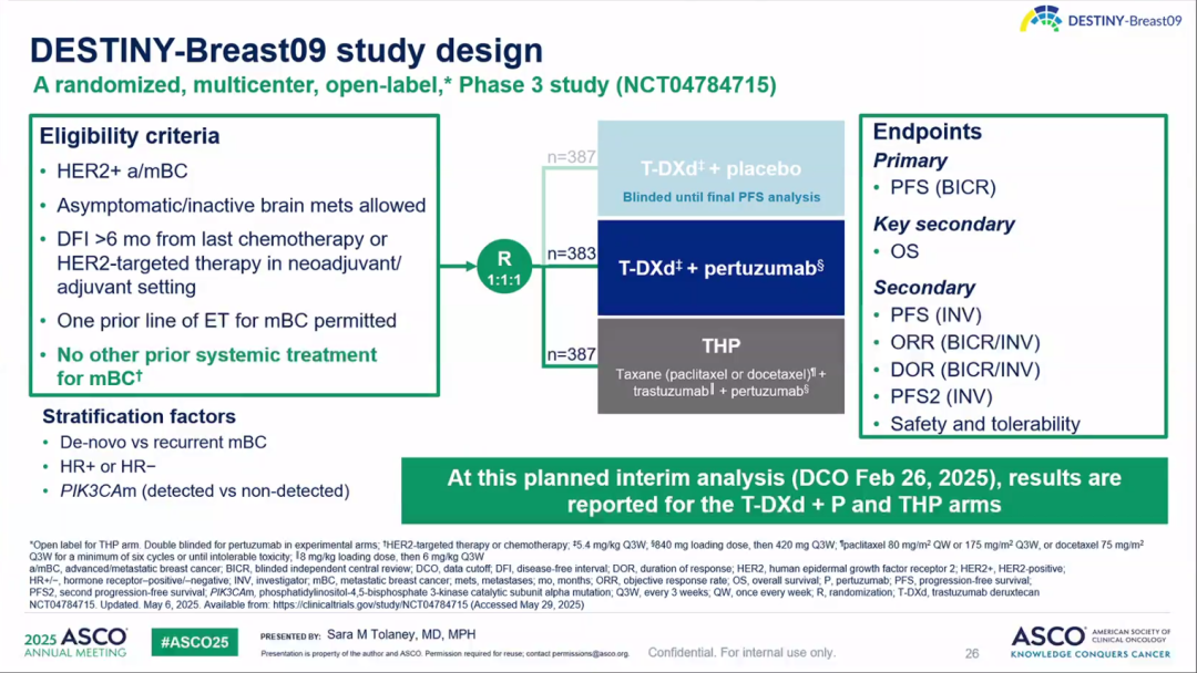 DESTINY-Breast09研究是一项随机、开放标签、国际多中心III期临床研究,旨在评价T-DXd±P对比标准THP方案一线治疗HER2阳性转移性乳腺癌患者的疗效和安全性。该研究主要针对既往未接受过晚期阶段的系统性治疗(允许曾使用一线内分泌治疗)的HER2阳性乳腺癌患者,按1:1:1随机分组后予以T-DXd单药治疗、T-DXd+P以及THP标准治疗方案。研究按既往治疗(初诊晚期或复发晚期)、激素受体(HR)状态和PIK3CA突变(PIK3CAm)状态预设随机化分层。主要终点是通过盲态独立中心评估(BICR)的PFS,次要终点包括研究者评估的PFS、OS、客观缓解率(ORR)、缓解持续时间(DOR)、至第二次进展或死亡的时间(PFS2)、安全性和耐受性(图1)。