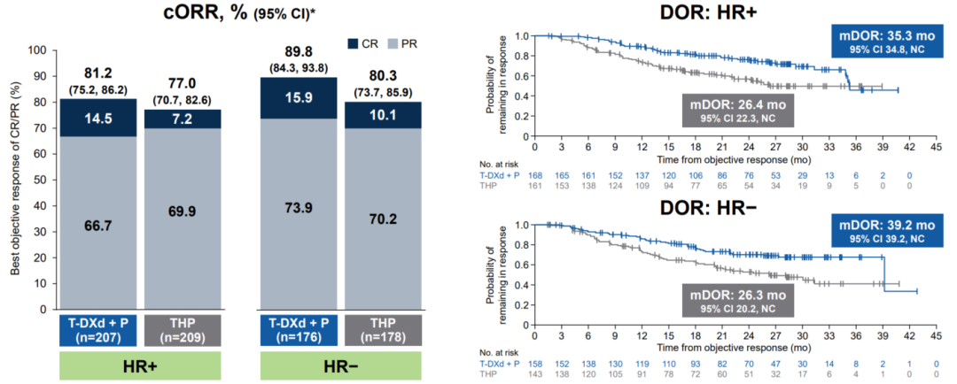 图5.HR阳性与HR阴性人群的PFS、cORR、DOR