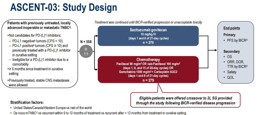 ASCENT-03研究共入组558例患者,入组患者随机(1:1)接受SG单药(10 mg,D1/8,q3W)或化疗(紫杉醇或白蛋白紫杉醇或吉西他滨+卡铂),化疗组经BICR确认疾病进展且符合条件的患者可二线接受SG治疗。主要终点是独立盲法中心评审(BICR)的无进展生存期(PFS)。次要终点包括总生存期(OS)、客观缓解率(ORR)、安全性等。