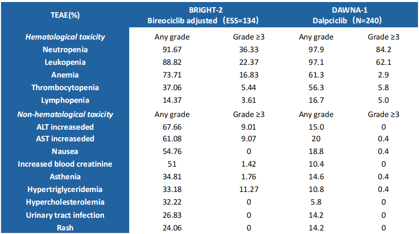 达尔西利是一种选择性CDK4/6抑制剂。在3期DAWNA-1试验(NCT03927456)中,达尔西利联合氟维司群在HR+/HER2-ET进展后ABC患者中显示出显著疗效,研究者评估的中位PFS达到15.7个月,而安慰剂联合氟维司群组为7.2个月(风险比<hr/>0.42;95%CI:0.31-0.58;P<0.0001)。然而,该方案与较高的血液学毒性发生率相关,包括≥3级中性粒细胞减少症(84.2%)和白细胞减少症(62.1%),胃肠道事件发生率极低。