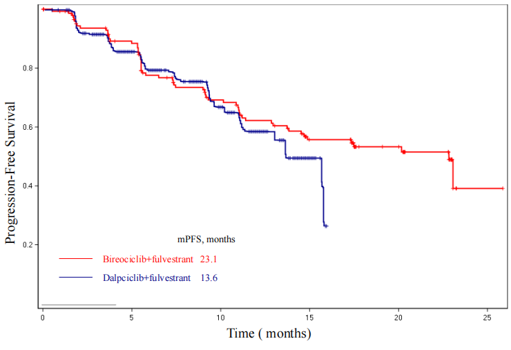 研究者评估的中位PFS显示,吡洛西利联合氟维司群为17.5个月,与达尔西利联合氟维司群(15.7个月)相比,呈现出更长的数值趋势。