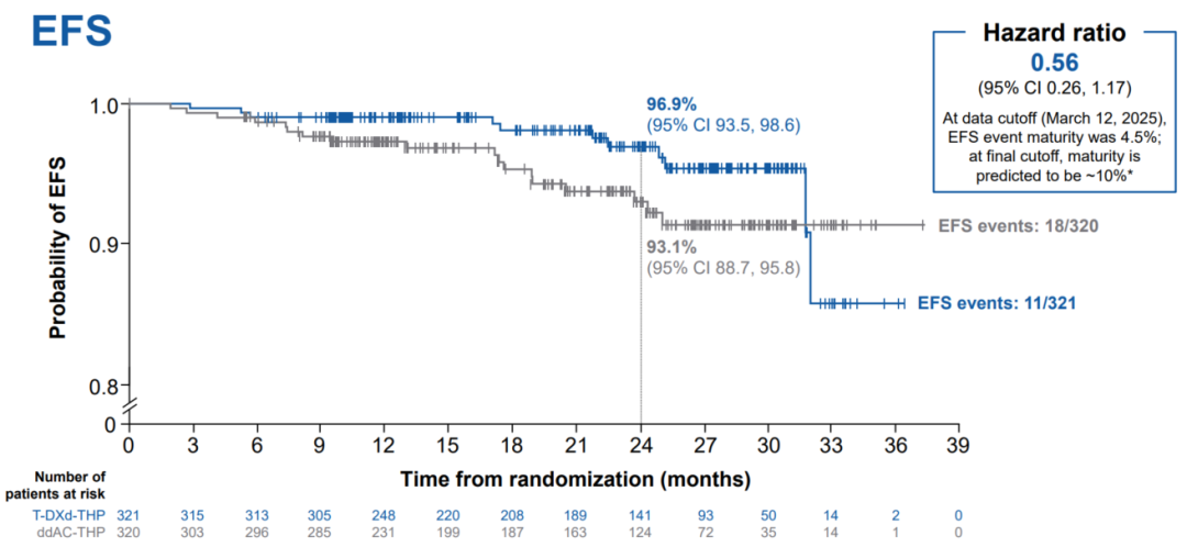 目前,全人群EFS尚不成熟,T-DXd-THP组较ddAC-THP组取得了优势趋势,24个月EFS率为96.9%vs 93.1%,降低了44%的疾病进展或死亡风险(HR 0.56,95%CI 0.26,1.17)。
