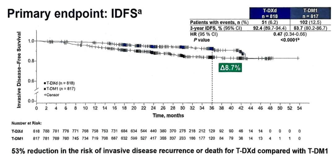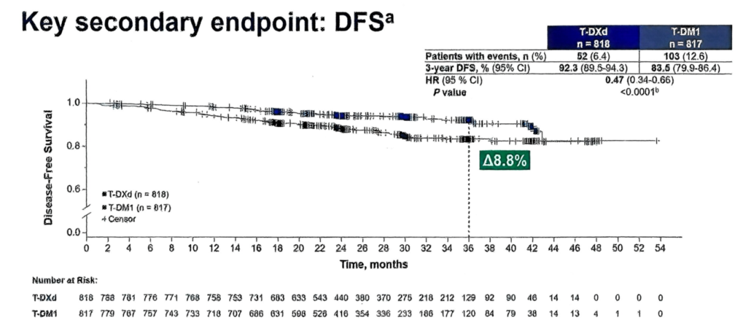该研究关键次要终点显示,T-DXd较T-DM1将疾病复发或死亡风险(DFS)显著降低了53%(HR=0.47;95%CI:0.34–0.66;P<0.0001),3年DFS率为92.3%vs 83.5%。