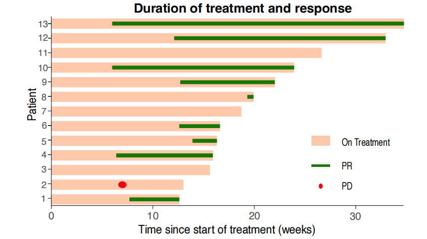 本研究为Ⅱ期试验,预设主要疗效终点为在30例入组患者中至少有6例达到完全缓解(CR)或部分缓解(PR)。然而,在仅13例可评估患者的阶段性分析中,已有9例患者达到CR或PR,提前达成研究的主要疗效终点。